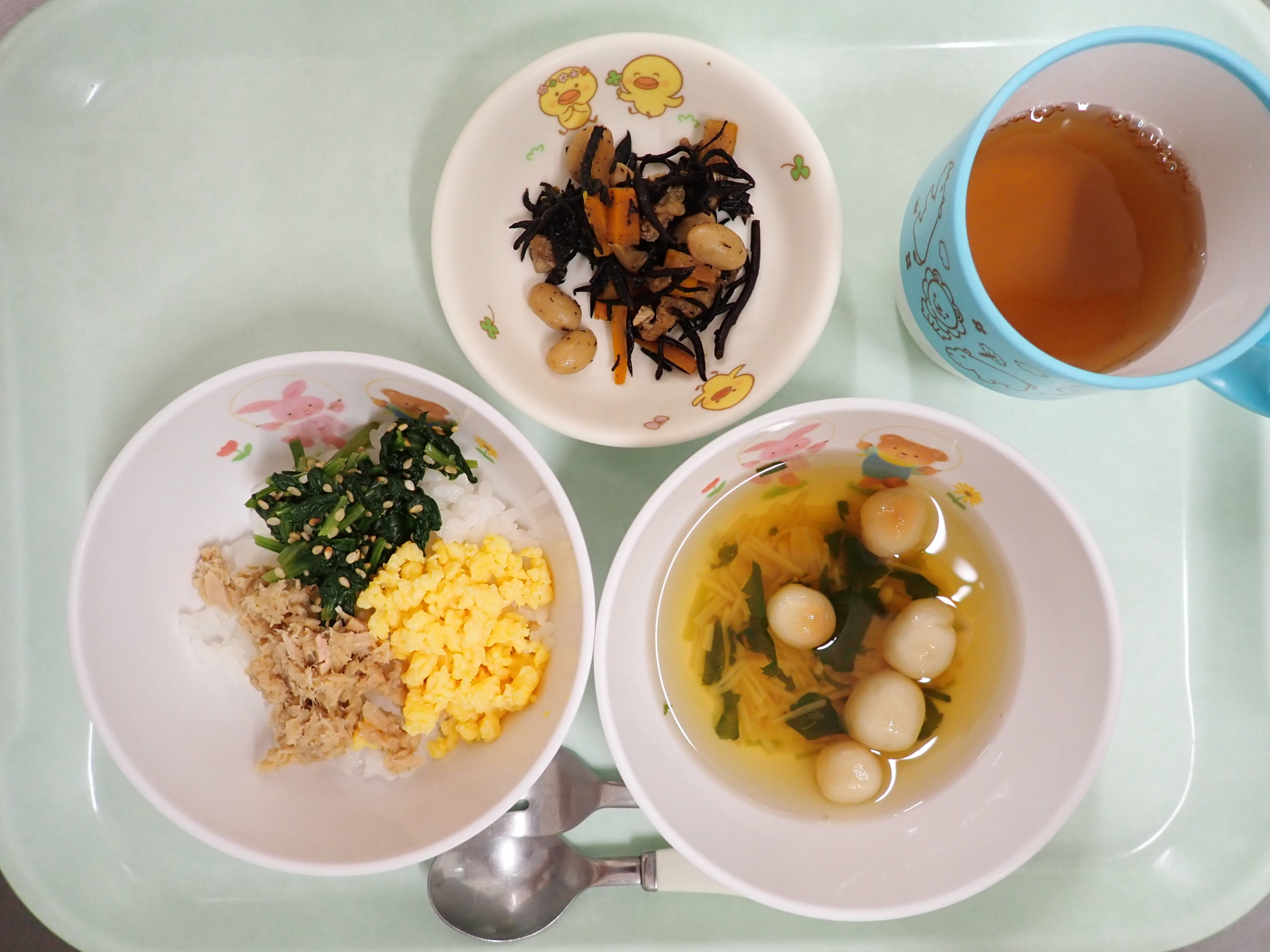 2025.9.12 給食室から 今日の給食 三色ごはん すまし汁 大豆とひじきの炒め煮 ○人参・・・北海道産 ○ほうれん草・・・岐阜県産 ○エノキタケ・・・長野県産 ○三つ葉・・・岐阜県産 ← 前の記事 次の記事 →